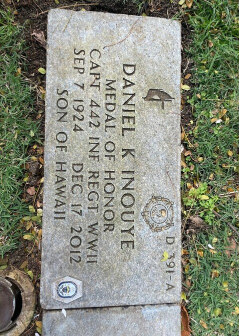Senator Daniel Inouye is buried at the National Memorial Cemetery of the Pacific, Located in Honolulu, Hawaii. He was buried alongside many others from his unit who also fought in WWII as well as his colleague Senator Spark Matsunaga who he served alongside during WWII and in the US Senate. His name is memorialized in several buildings throughout Hawaii, including the airport that bears his name.